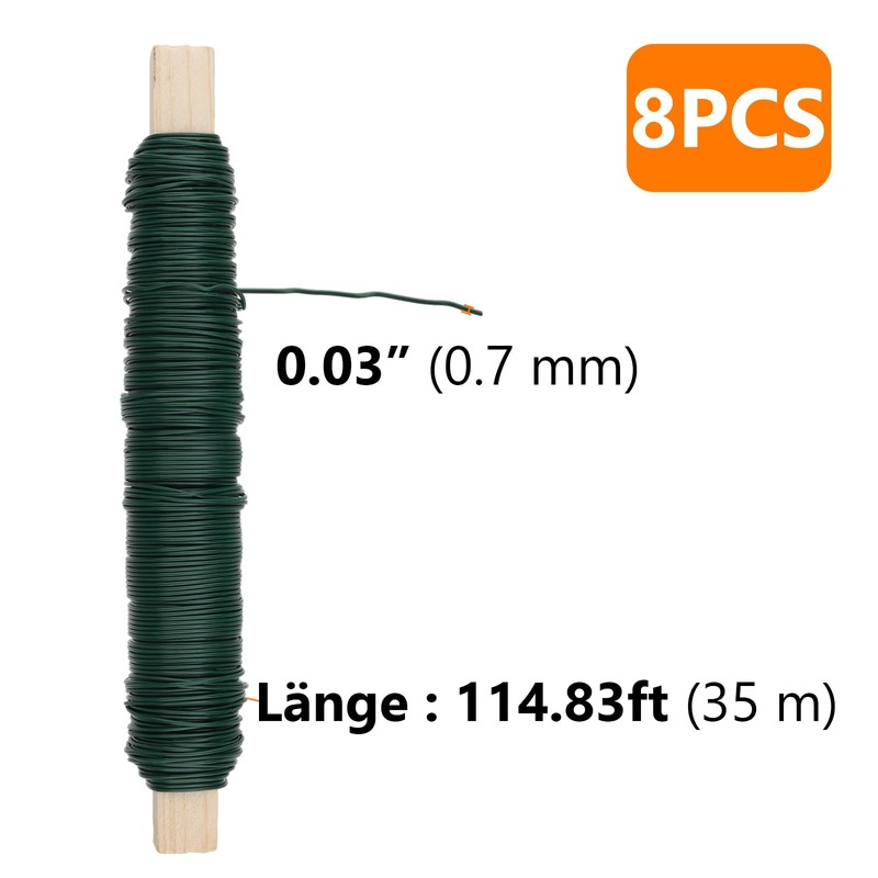 B: You will receive 8 green wire wreath ties, thickness 0.7 mm, length 35 m, made of metal wire.