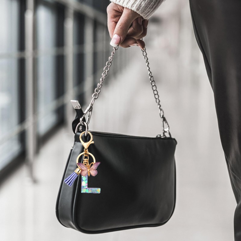 These letter keychains, made of high quality epoxy resin, are lovingly decorated with a delicate resin butterfly and tassel, making a charming accessory.