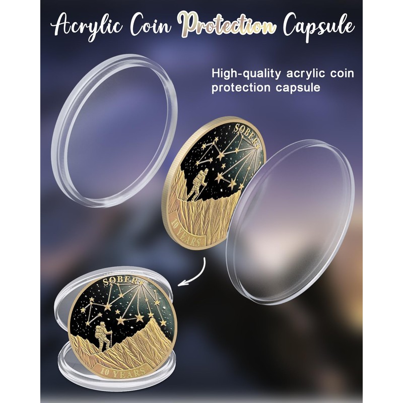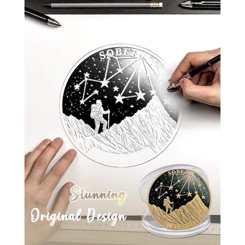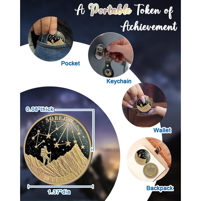 - Stunning Original Design: The front of this 10 year sobriety coin shows a climber scaling a mountain, guided by a starry sky—symbolizing the challenges and hopes along the journey to sobriety. The stars represent purpose and direction, reminding the holder to face each step with courage. On the back, an encouraging message urges people to let go of past shadows and future worries, focusing instead on staying present and positive throughout their path to sobriety