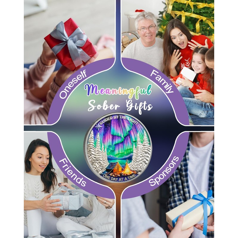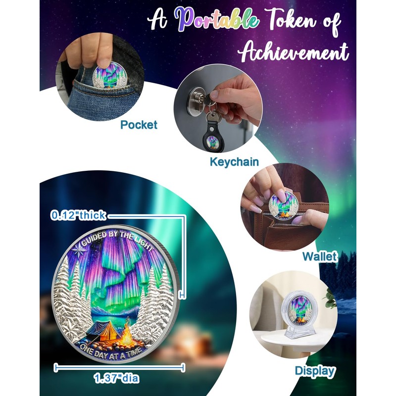 - Inspirational Message: This sobriety chip symbolizes the journey from darkness to light, reminding those on the path to sobriety that each step is filled with hope and strength. The Northern Lights and a campfire's glow represent inner fortitude and the power to light the way forward, inspiring individuals to seek guidance and support through life’s challenges. It encourages focusing on positive change, leaving behind past regrets, and moving closer to a future full of hope, and strength