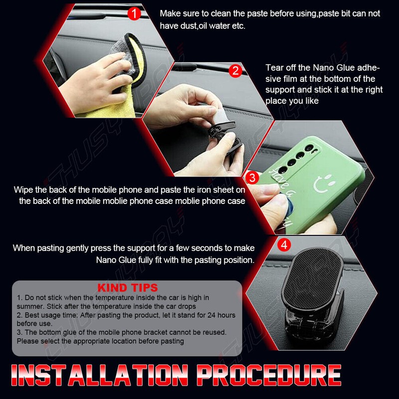 Peel off the Sticker from the Metal Plate and Stick it to the Cellphone, Apply Pressure for 60 seconds Then tear off the sticker from the double-sided sticker and stick it on the bottom of the bracket.Apply the Pressure for 60 Seconds.