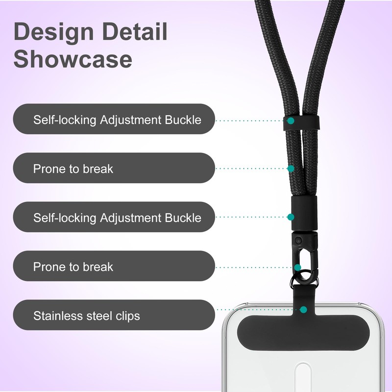 - Durable material: the universal mobile phone strap is made of high-quality nylon material and alloy and is 20 cm long. The soft, skin-friendly material does not feel tight even during prolonged wear. The 360° rotating buckle and adjustable buckle with double holes are double reinforced, so you don't have to worry about accidentally dropping your phone - it is very safe!