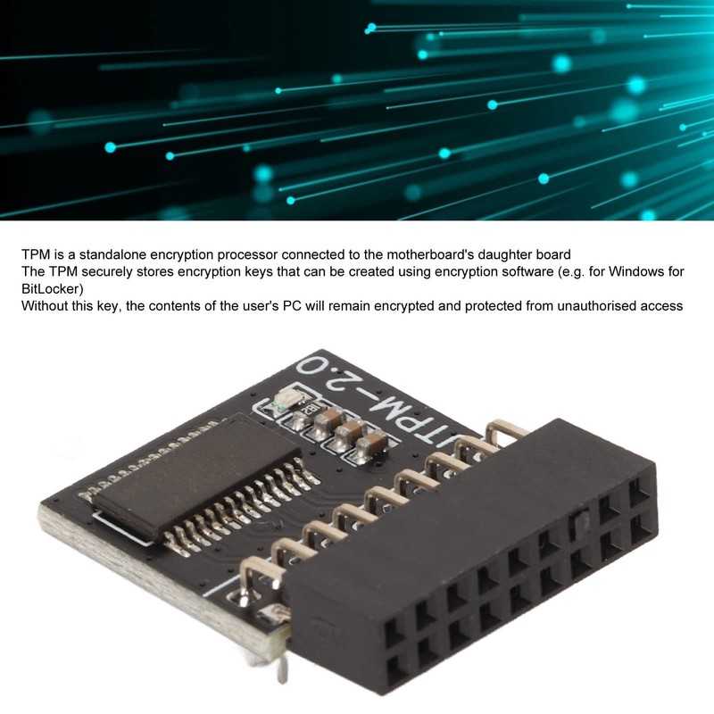 1. Secure Storage: The TPM is a standalone encryption processor connected to the motherboard's daughter board. The TPM securely stores an encryption key that can be created using encryption software ( for Windows for BitLocker). Without this key, the content on the user's PC will remain encrypted and protected from unauthorised access.