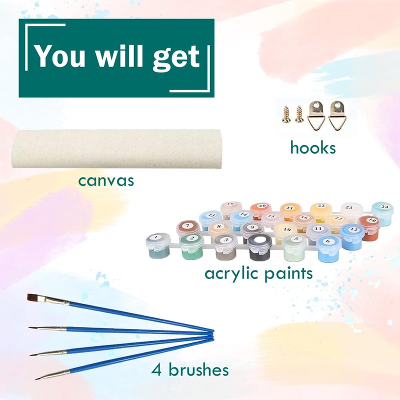 - Easy painting by numbers: the paint by numbers is suitable for adults, children and beginners. The painting process is so simple that everyone can easily complete this beautiful picture. Simply apply the number pigments to the corresponding number ranges on the canvas. The artistic creation process will make you feel that you are becoming a painter