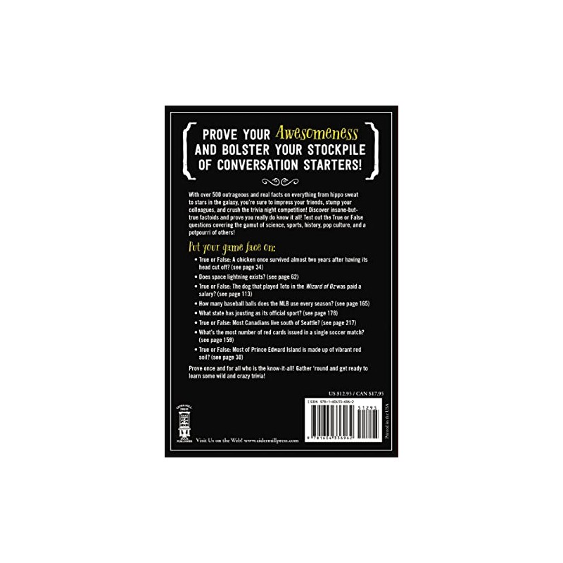 Prove you are the smartest schmuck in the room with 500 true trivia facts that sound absurd. These facts are so far-fetched some might even say that they sound like bull$#*t! Give the gift that keeps giving to friends, family, fathers, or grads.Knowledge is power! Crush the competition at trivia night, or start the most interesting conversation ever with real facts that are hard to believe. This book is loaded with mind-blowing facts that are sure to keep you wondering, "How are these even true?" while equipping you to outsmart everyone around and blow their minds. Topics include: Science American Sports History Pop Culture NaturePut your game face on, and prove once and for all that you are the real know-it-all! Gather your friends and family 'round and get ready to learn some wild and crazy trivia and facts such as: True or False? A chicken once survived almost two years after having its head cut off. True or False? The dog that played Toto in The Wizard of Oz was paid a salary. How many baseballs does the MLB use every season? What state has jousting as its official sport? True or False? Most Canadians live south of Seattle.Stump everyone with True Facts That Sound Like Bull$#*t!