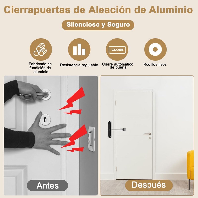 Detalles perfectos:El Cierrapuertas de Aleación de Aluminio Silencioso y Seguro tiene una estructura estable, superficie pulida lisa y sin rebabas. Perfecto para dormitorio, garaje de casa. Puede comprarlo y utilizarlo con confianza.
