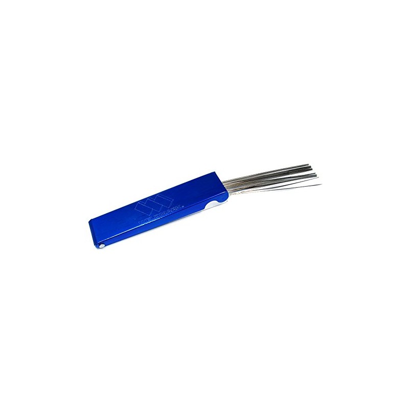 This is a handy set of round files, originally intended for cleaning the tips of torch welders, but absolutely perfect for filing string slots into nuts and bridges for cigar box guitars! The self-contained set features a range of 13 sizes. Unlike most standard tip cleaners, these feature longer shaft length with a 1.5" length of file towards the end, which makes them easier to use for filing string slots. If you have always had trouble getting your string slots just right, pick up one of these and give them a try! Many builders, including C. B. Gitty himself, already do! The size (diameter) of the files range from 0.015" (0.38mm) at the smallest up through 0.0615" (1.54mm) at the largest. It should be noted that these files, especially the smaller ones, are thin metal and bend easily. As such, some care is recommended when using them, so that they will last you a good while. These are recommended for wood and bone, and soft metals such as brass, copper or aluminum. Not recommended for hard or ferrous metals.