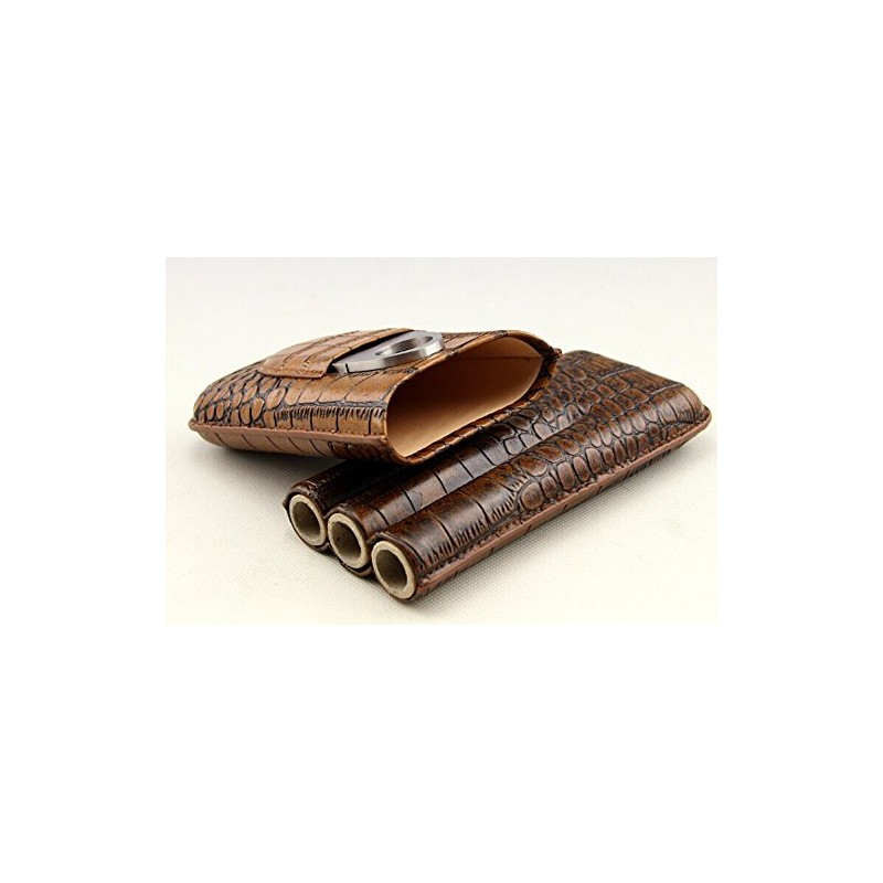 CIGAR IN STYLE Brown Crocodile Embossed Leather 3 Ct Cigar Case w/Stainless Steel Cutter for Large Cigar