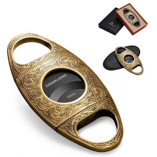 CIGARLOONG Cigar Cutter Stainless Steel Bronze Engraved Double Cut Blade Cigar Guillotine (Gold+Black)