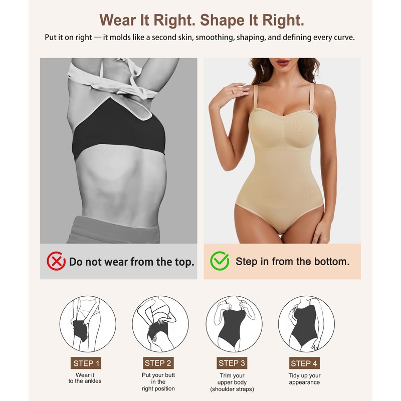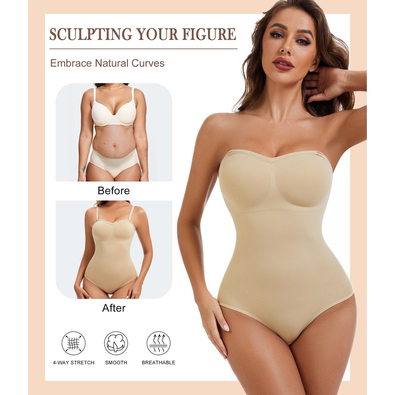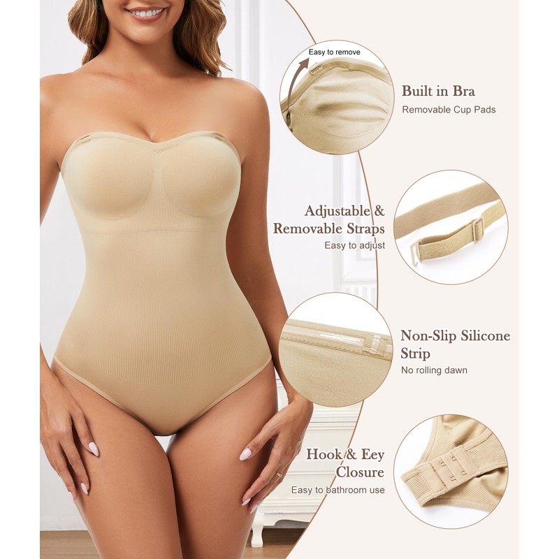 - TUMMY CONTROL AND BUTT LIFTER SHAPEWEAR: This Shapewear for Women provides full control over your body shape. The strapless bodysuit tummy control offers moderate compression that effectively flattens the tummy, slims the waist, and smooths the back to hide bumps and bulges, creating a more charming silhouette and bringing you closer to the perfect hourglass figure