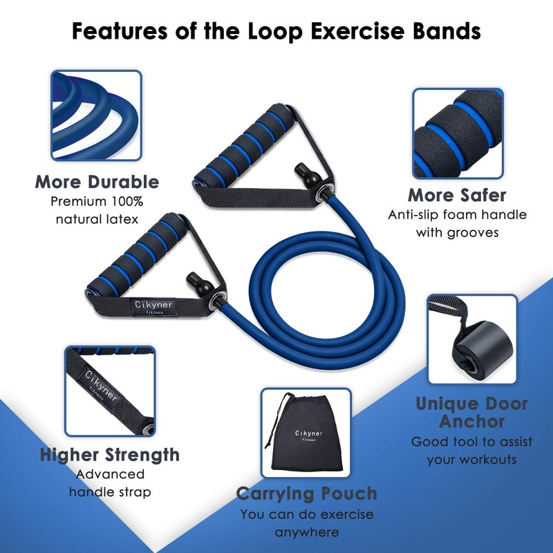 - Non-slip foam handles and additional door anchor. The tubes resistance bands are equipped with two non-slip foam handles that feature blue grooves. They sit very comfortably in the hand and guarantee you a better training. And with the door anchor made of dense but soft foam, you can attach it to the top, middle and bottom of the door so you can complete more fitness programs.