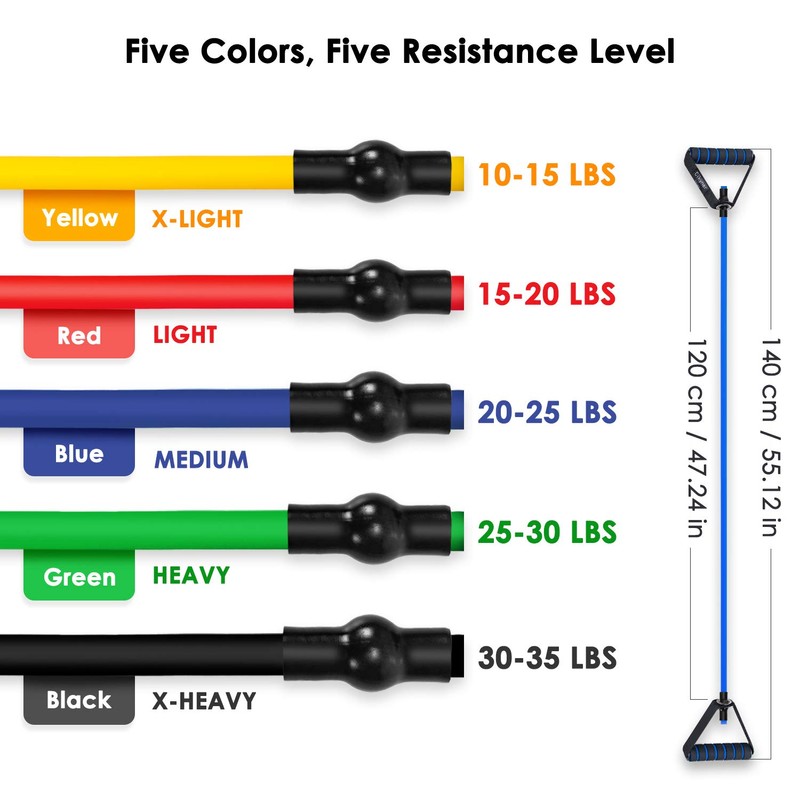 - Five colours, five resistance levels. The resistance tubes have five colours with five different resistance levels. Yellow: 10-15lbs X-Light Red: 15-20 pounds, lightweight. Blue: 20-25 pounds, medium Green: 25-30 pounds, heavy. Black: 30-35lbs, X-Heavy. This allows you to complete different levels of exercise or training.