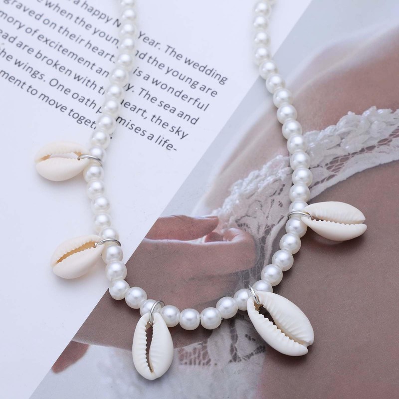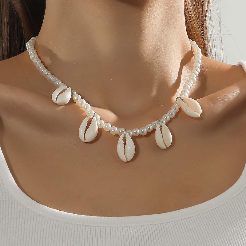 Cimenexe Bohemian Pearl Shell Choker Necklace Round Pearl Necklace Cauri Shell Pendant Necklace Natural Shell Pearl Necklace Jewellery for Women, Zinc, No Gemstone