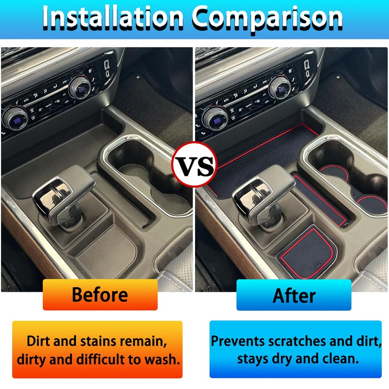 • Installation Guide: Our precision-engineered cup holder liners are custom-molded to match your vehicle's original console design, requiring no additional tools or accessories for installation. For best results, we recommend thoroughly cleaning the console grooves before installation. Simply align each liner with its corresponding compartment and press gently into place