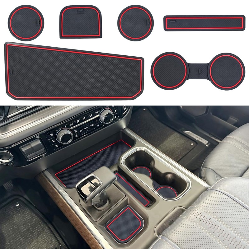 CIMOF Center Console Liner for Chevy Silverado 1500 / GMC Sierra 1500 Accessories 2023 2024 2025 Cup Holder Mat, Coaster Trim, Anti-Dust Interior, Non-Slip Pad, Custom Rubber Insert (6pcs, Red)