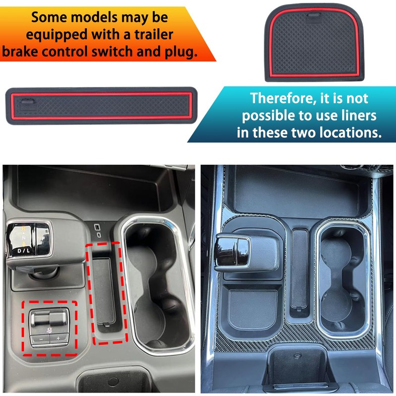 • Product Features: Our premium rubber coasters are crafted from high-quality, durable material that maintains its shape while providing a soft-touch surface. The innovative 3D textured design securely holds your items in place, preventing movement during travel. These protective liners offer complete coverage for your truck's console, effectively guarding against spills, scratches, dust accumulation, and other potential damage to your vehicle's interior
