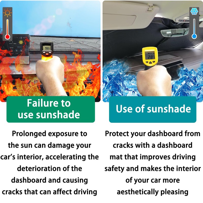 - High quality material: This windshield sunshade is made of 210T Reflective Fabric both double reflective layers and double thermal insulating layers. Not only is it durable, high temperature resistant, odorless and safe to use, but the soft texture can make shading and insulation more effective