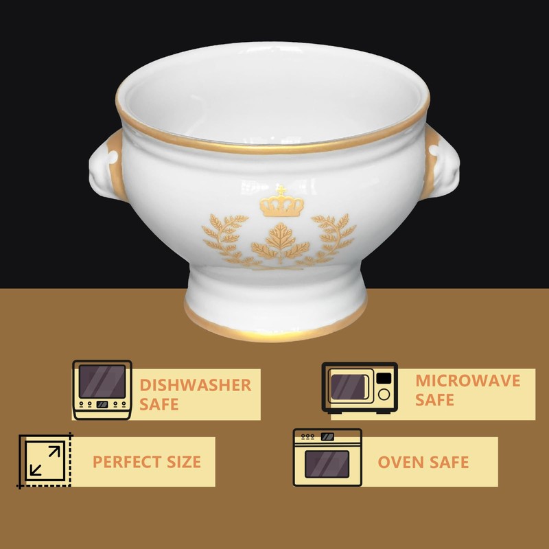 Cinf Ceramic 12 oz Set of 4 Lion Head Porcelain Soup Bowls White Faux Gold Gifts Microwave Safe Soup and Fruit Home Kitchen(Small,Onion Soup/Desserts)