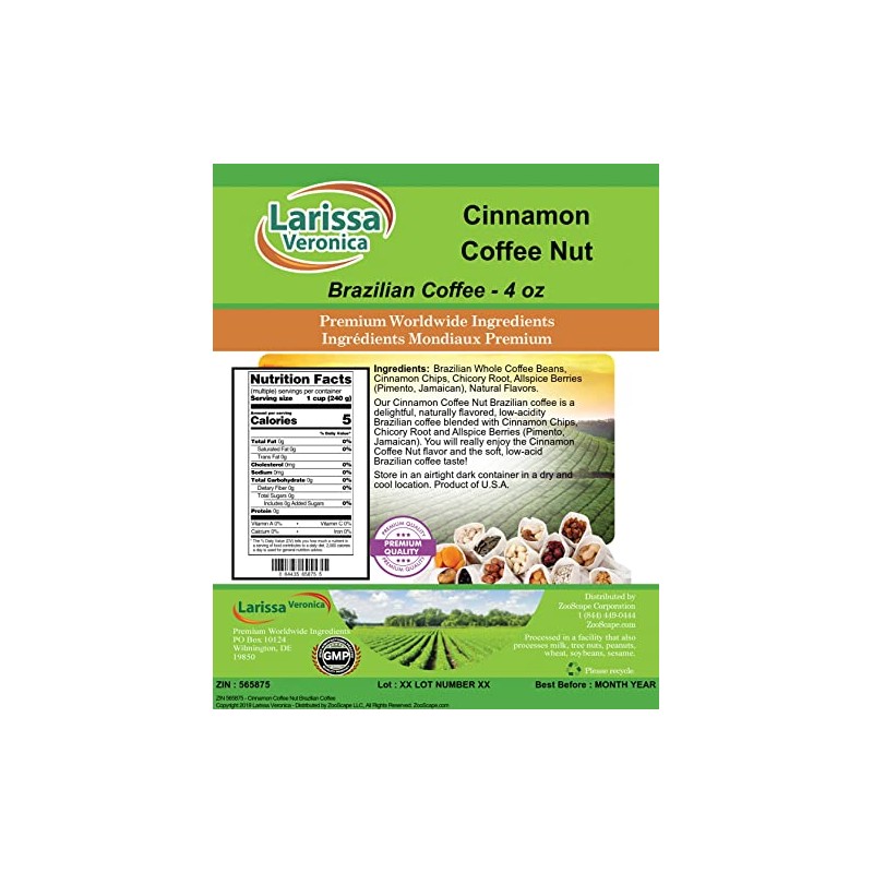 - Our Cinnamon Coffee Nut Brazilian coffee is a delightful, naturally flavored, low-acidity Brazilian coffee blended with Cinnamon Chips, Chicory Root and Allspice Berries (Pimento, Jamaican). You will really enjoy the Cinnamon Coffee Nut flavor and the soft, low-acid Brazilian coffee taste! - Ingredients: Brazilian coffee (whole coffee beans), Cinnamon Chips, Chicory Root, Allspice Berries (Pimento, Jamaican) and Natural Cinnamon Coffee Nut Flavor.