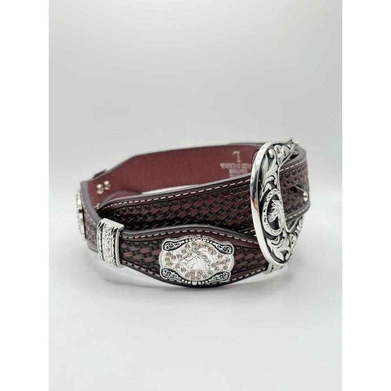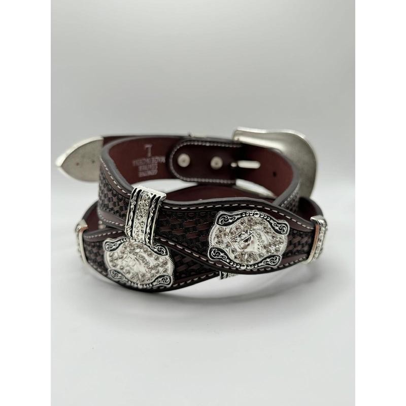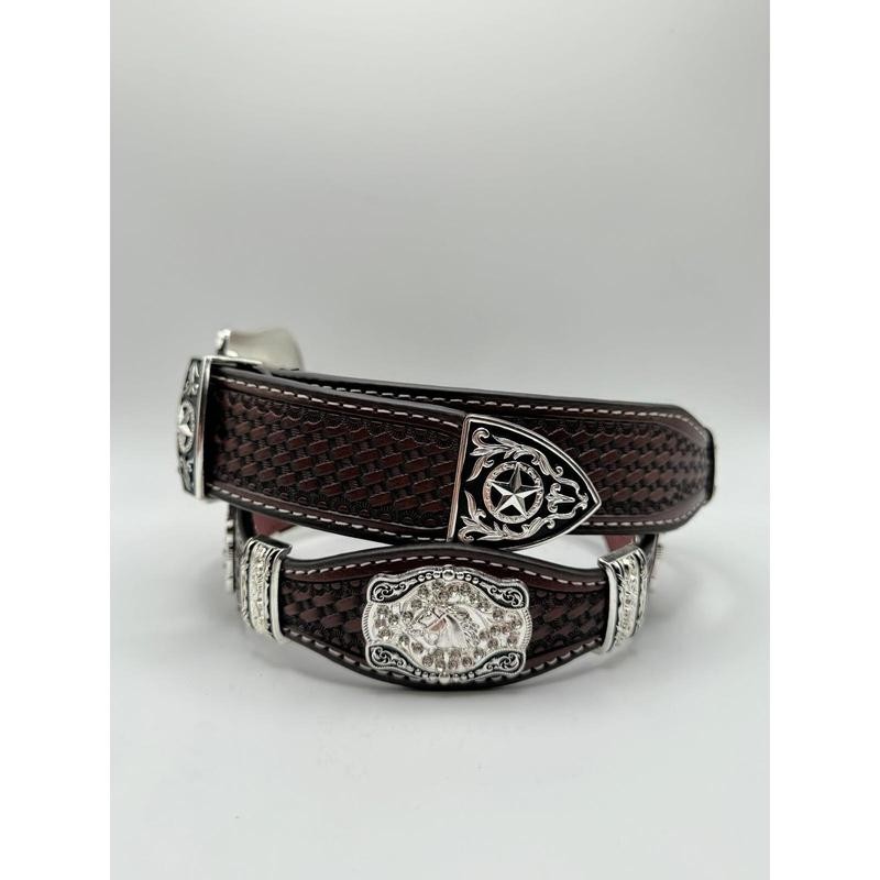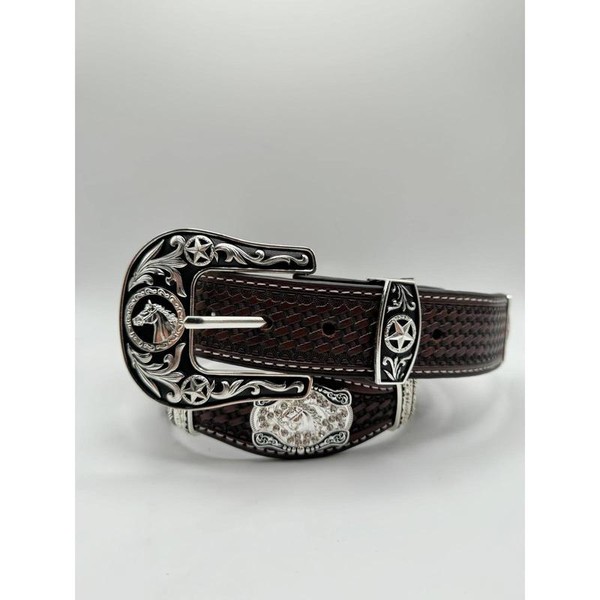 Premium brown genuine leather with basketweave texture Intricately engraved silver conchos with stallion motif Texas star buckle with detailed silver scrollwork Durable craftsmanship with high-quality stitching Perfect for rodeo wear, Western events, or everyday fashion