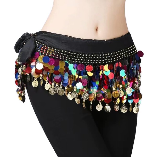 Cinturón de monedas para mujer, bufanda de cadera con flecos, Negro 2, 0X