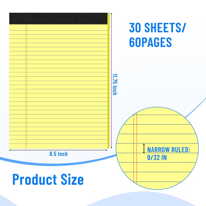 - PRODUCT SIZE AND NUMBER OF PAGES: Sufficient number of pages (30 sheets per pack,12 packs ,total of 360Sheets), Spacing 7MM line of notepads (Narrow-Ruled: 9/32 Inch), convenient of size (8.5x11inch), and 8.5x11 inch size makes it versatile and can be used to create reminders, to-do lists and notes.