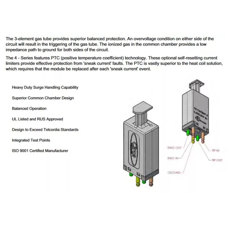 Quantity of Ten (10) Circa Telecom ® C3B1E BAL Surge Protection Modules. 5 Pin 3 Element Gas Tube. 100 MOHM input. 350v clamping. DC breakover at 2KVPS. Excellent transient and power fault protection. New.