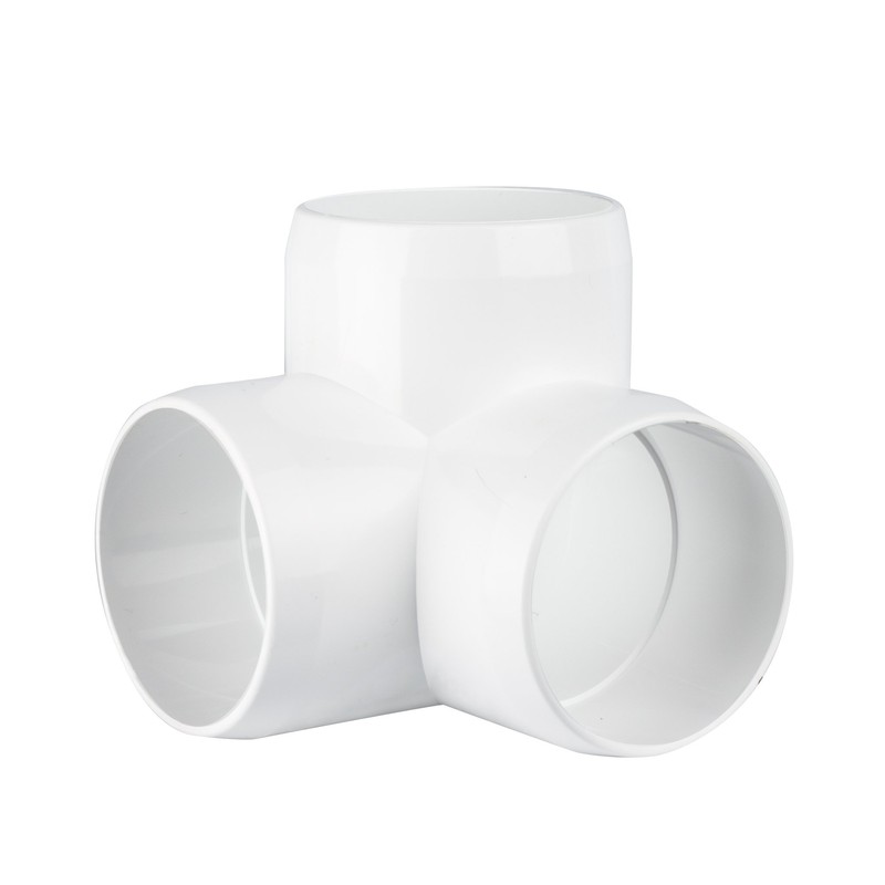 The 3 way L PVC pipe fitting also known as a 90 degree side outlet ell or corner fitting is commonly used to build a box or cube out of PVC pipe. It is also useful to make the ridge ends on PVC greenhouses or small PVC buildings. All three outlets are non-threaded sockets and are compatible with furniture grade PVC pipe or standard PVC pipe from a hardware store. Furniture Grade means this fittings has a non-marked, glossy finish.