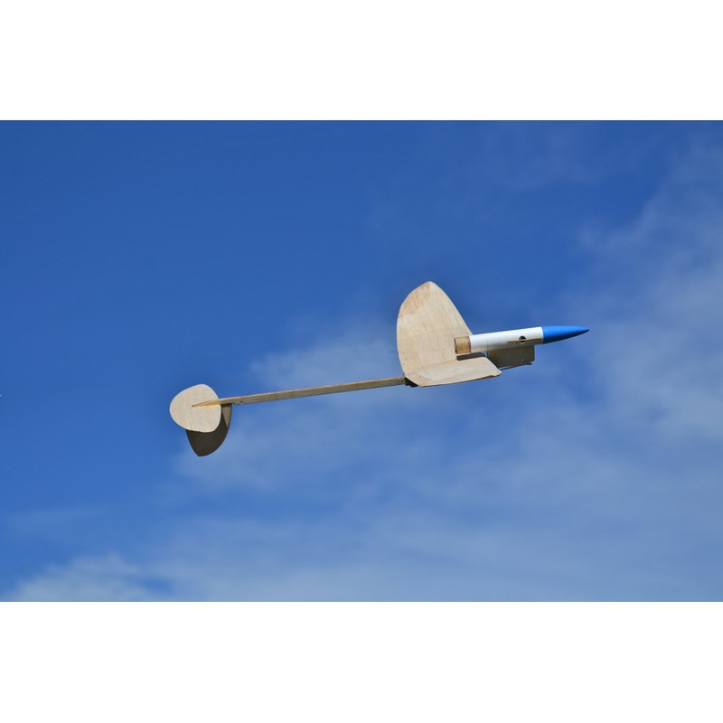 - Transitions from a rocket to a glider by a sliding wing mechanism