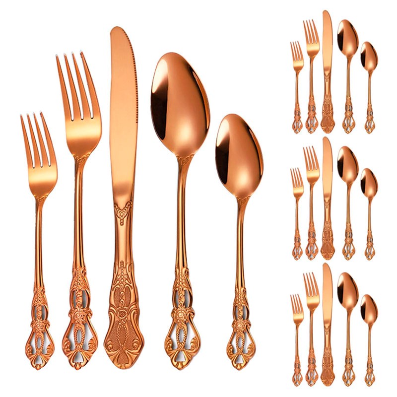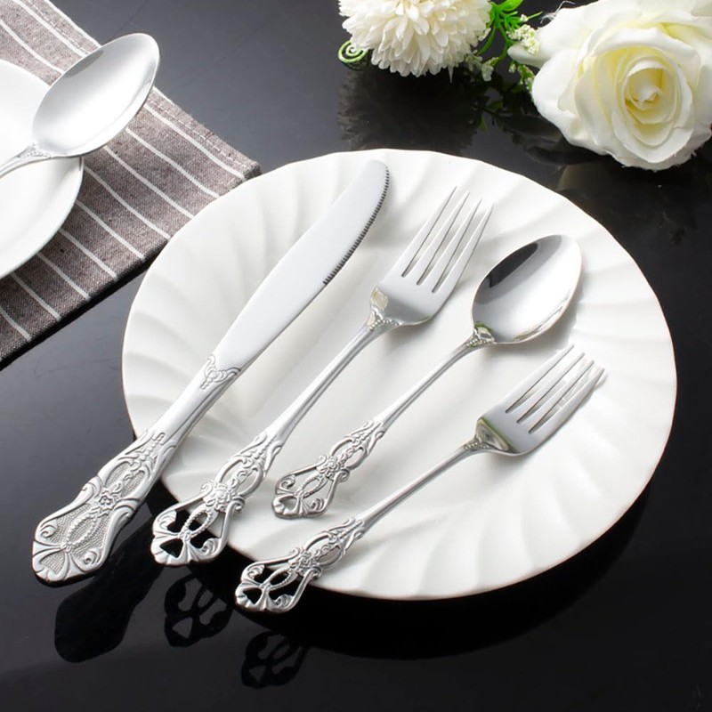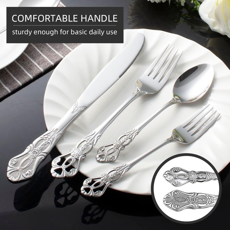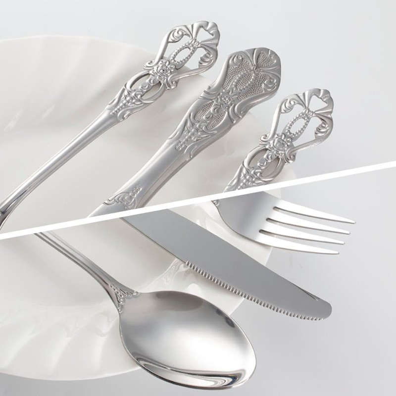 - LUXURY ROYAL DESIGN: Vintage royal design, exquisite embossed, add more elegance and classical atmosphere to your dining table. High mirror polishing, smooth edge and no burrs, ensuring your mouth safe and enjoying a pleasant dining experience.