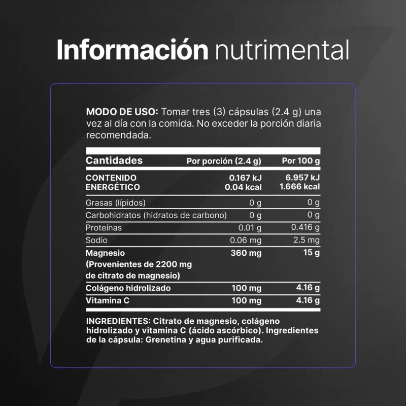 Esta fórmula especial contiene una máxima concentración de magnesio, un mineral esencial para ti. Además, está potenciada con vitamina C y colágeno hidrolizado, una mezcla de minerales, proteínas y vitaminas que impulsan tu bienestar.