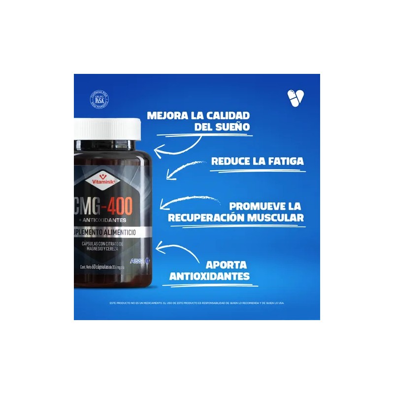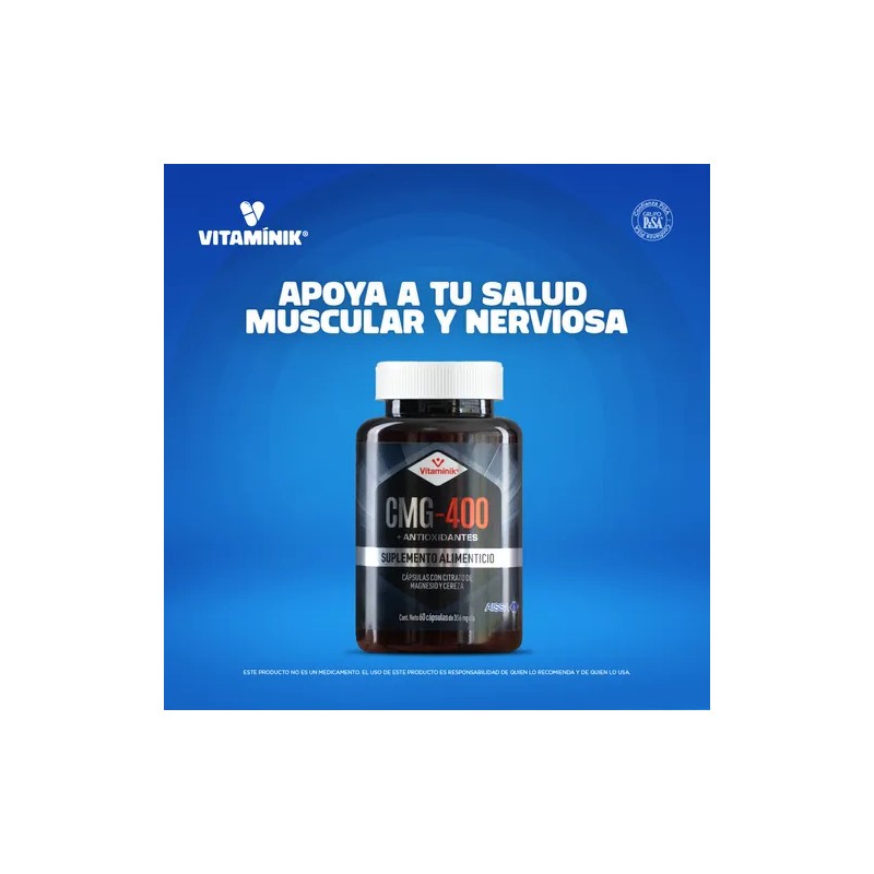 Descubre los beneficios del Citrato de Magnesio Vitamínik CMG-400, un suplemento diseñado para apoyar tu bienestar integral. Con extracto de cereza y 356 mg de magnesio por cápsula, es ideal para el cuidado de tu salud nerviosa, muscular e inmunitaria.