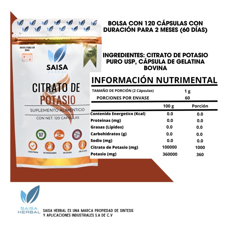 Citrato De Magnesio Y Citrato De Potasio 120 Cápsulas C/u Sin Sabor