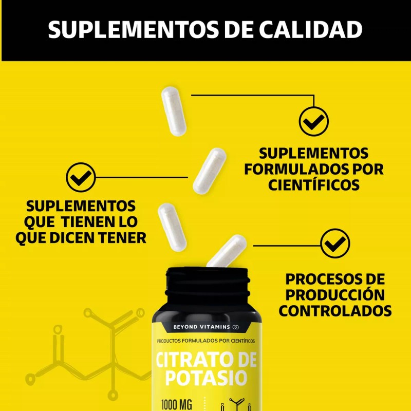 Citrato de Potasio Beyond Vitamins contiene Citrato de Potasio 1000mg Puro. Sin rellenos. Nuestro producto son el resultado de investigación y estrictos estándares de control de calidad. Es ideal para hombres, mujeres y personas mayores. Nuestro Citrato de Potasio es libre de lácteos, soya, hormonas, antibióticos, conservantes, azúcar, colorantes y sabores artificiales. ES VEGANO.