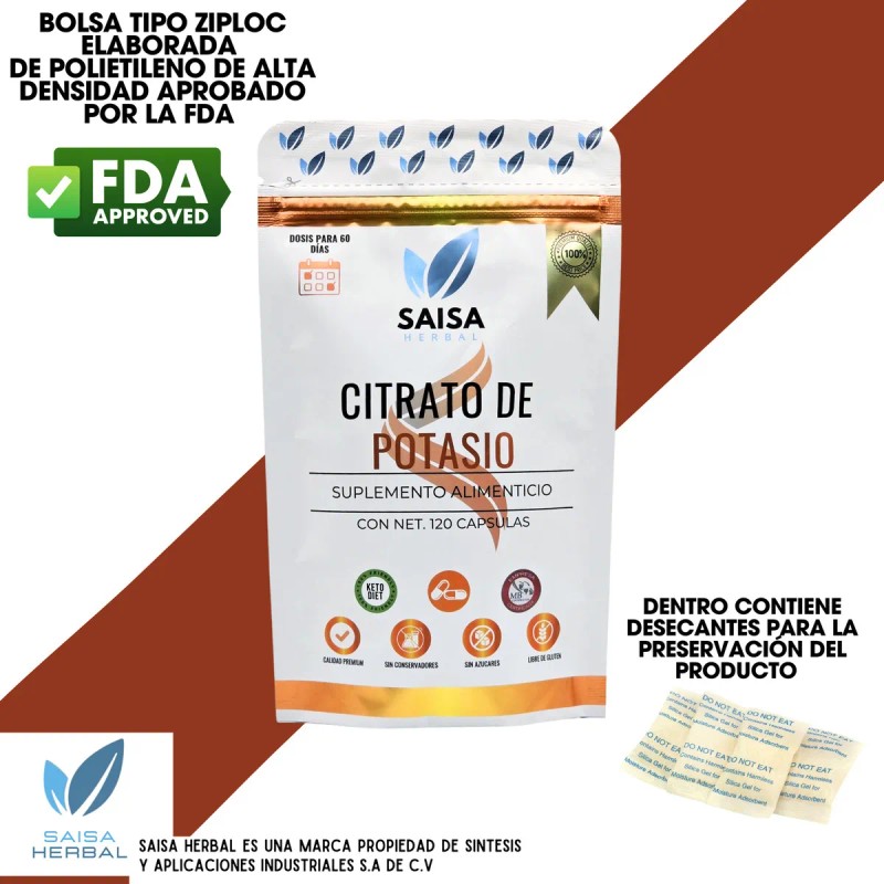 Citrato De Potasio 2 bolsas con 120 capsulas cu. Suplemento Alimenticio Alta Biodisponibilidad Saisa Herbal Ayuda A Prevenir Clculos Renales,...