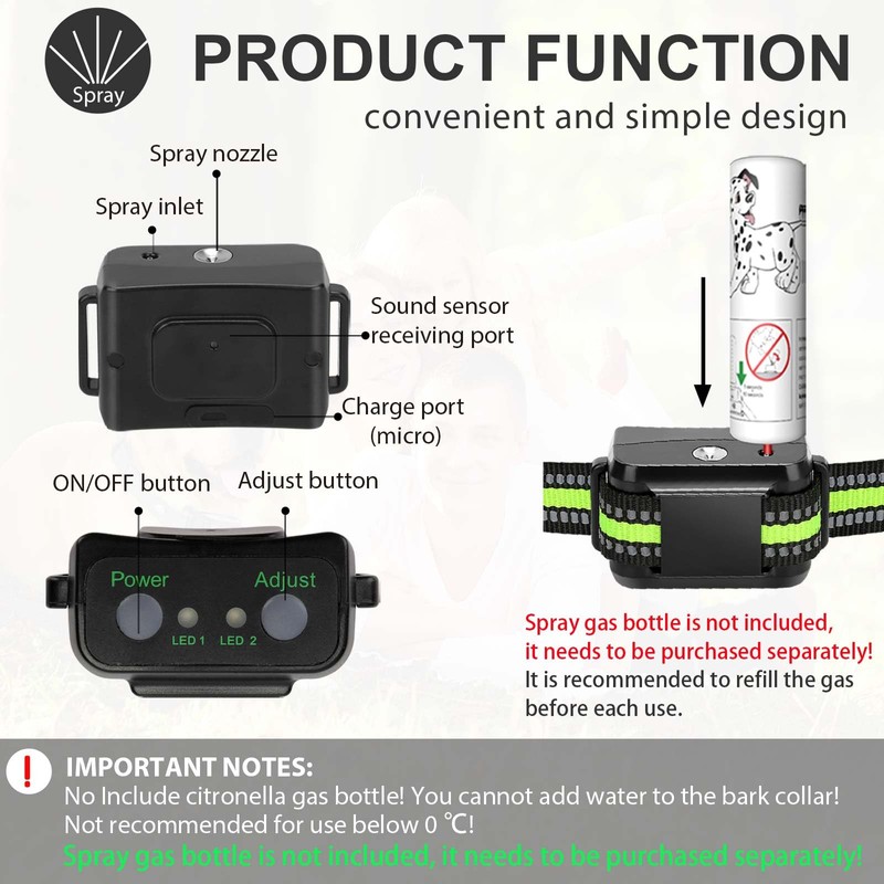 - [Purchase with Peace of Mind] There is no spray refill prepared inside the collar, Please fill it with citronella spray after receiving the goods. Our collar is not equipped with citronella spray liquid and needs to be purchased separately. After receiving the collar, please charge it first. Our collars are not ready for charging