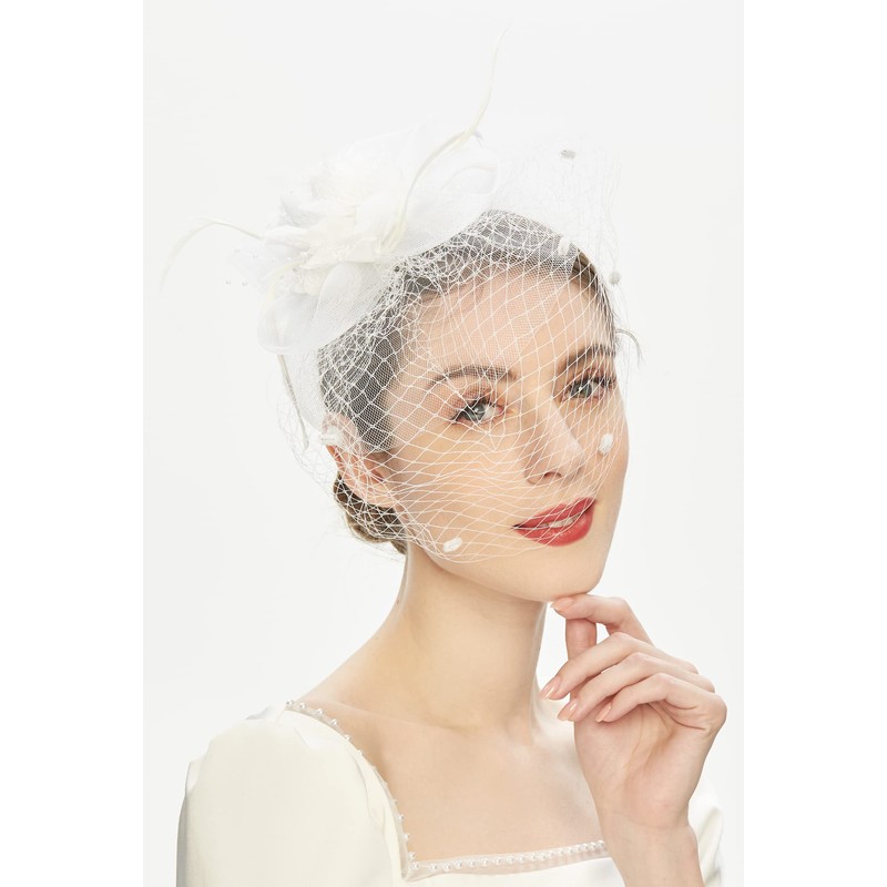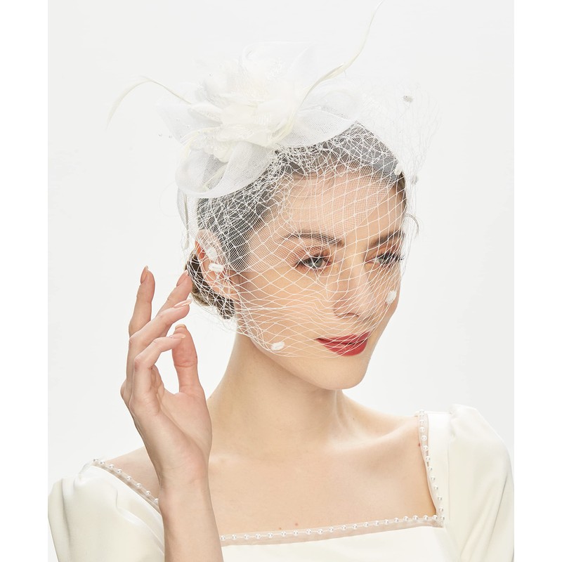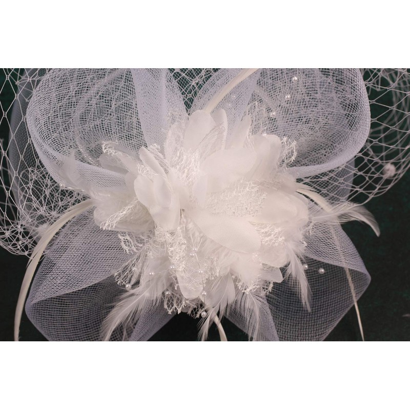 Cizoe Fascinator Hats for Women Tea Party Headband Derby Wedding Flower Mesh Veil Fascinator (A-white)