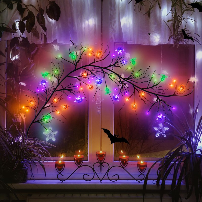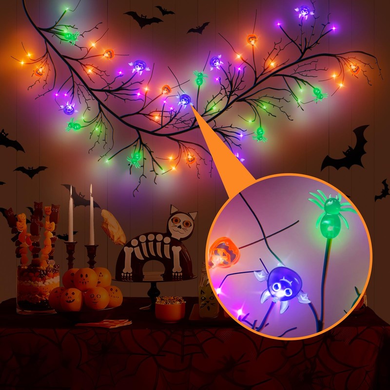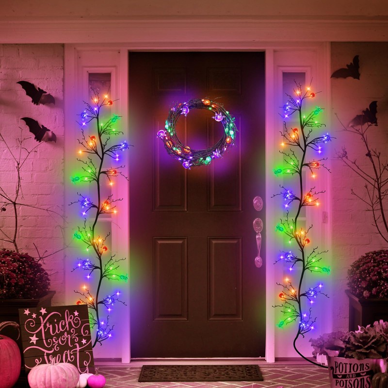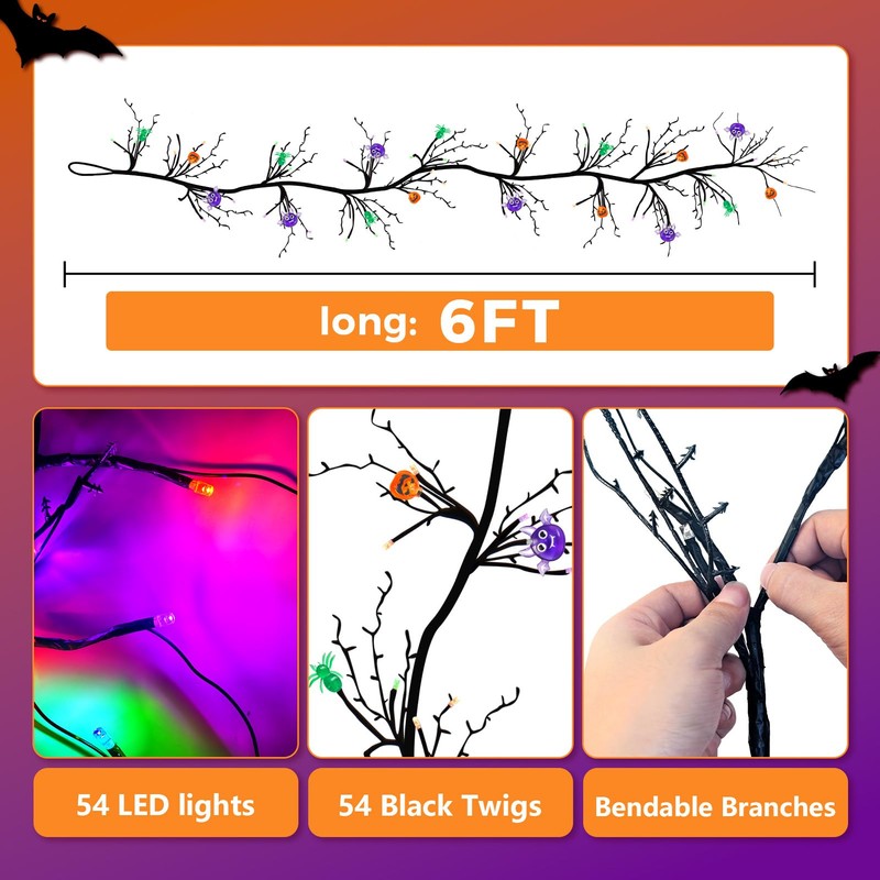 - Halloween Willow Wine Lights: 6ft 54 LED Halloween willow vine twig with purple & orange lights. Total 18 large branches and 54 smal tiwgs. The newly upgraded Halloween garland vine look scray and more terrifying, perfect for spooky black Halloween decorations