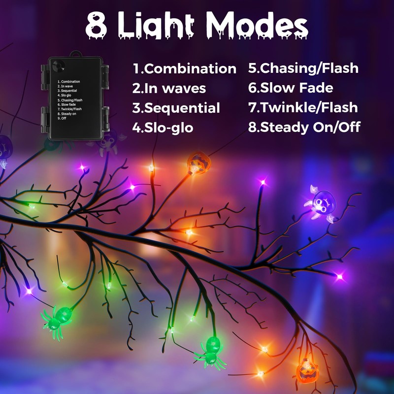 - 8 Light Modes & Memory Function: The battery-operated Halloween twig garland offer 8 modes: combination, waves, flash, sequential, slow glow, slow fade, twinkle, and steady on. Once you select a mode, the lights will remember and use it next time