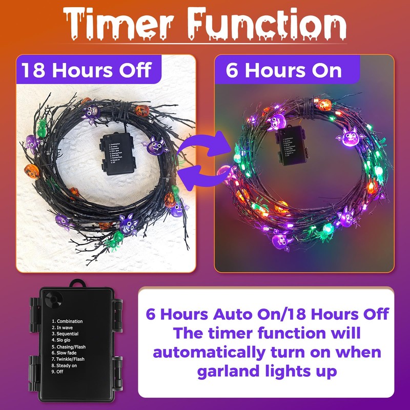 - Timer Function: Powered by 3 AA batteries (not included), the Halloween decoration willow vine lights features a timer that runs for 6 hours, turns off for 18 hours, and repeats daily until turned off, reducing repetitive operation
