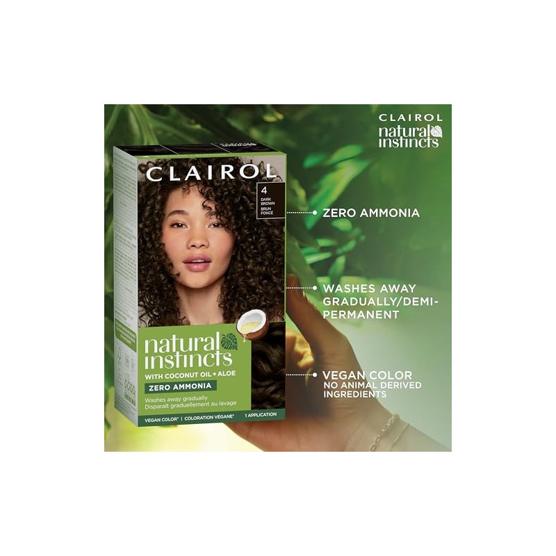 Clairol Natural Instincts enhances your look with rich, radiant color and glossy, gotta-have-it shine! It's a zero ammonia formula with Coconut Oil + Aloe, that conditions your hair leaving it smooth and radiant. This vegan* formula gives you no commitment gentle color that blurs visible grays and washes away gradually . Available in 37 natural-looking shades, so you can find the black, brunette, blonde, or red hue that's totally you. Discover your natural way to shine with Clairol Natural Instincts! *Learn more about Vegan on our website.