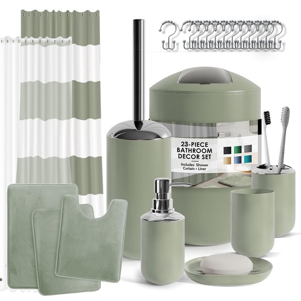 Clara Clark Bathroom Set - Sage Green Bathroom Accessories Set, Bathroom Sets with Shower Curtain and Rugs, 23PC Shower Curtain Set with Liner, Soap Dispenser, Soap Dish, and Toilet Brush Holder