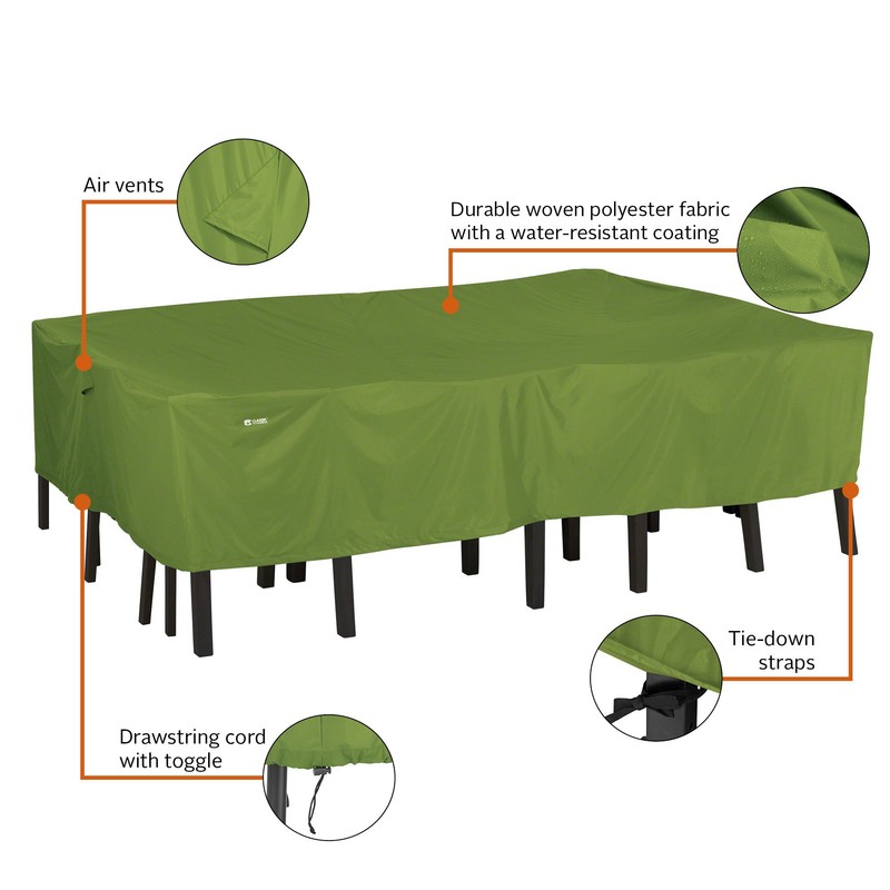 - STYLISH PATIO FURNITURE COVER: Fits rectangular/oval patio tables and 6 standard patio chairs 88"L x 58"W x 23"H