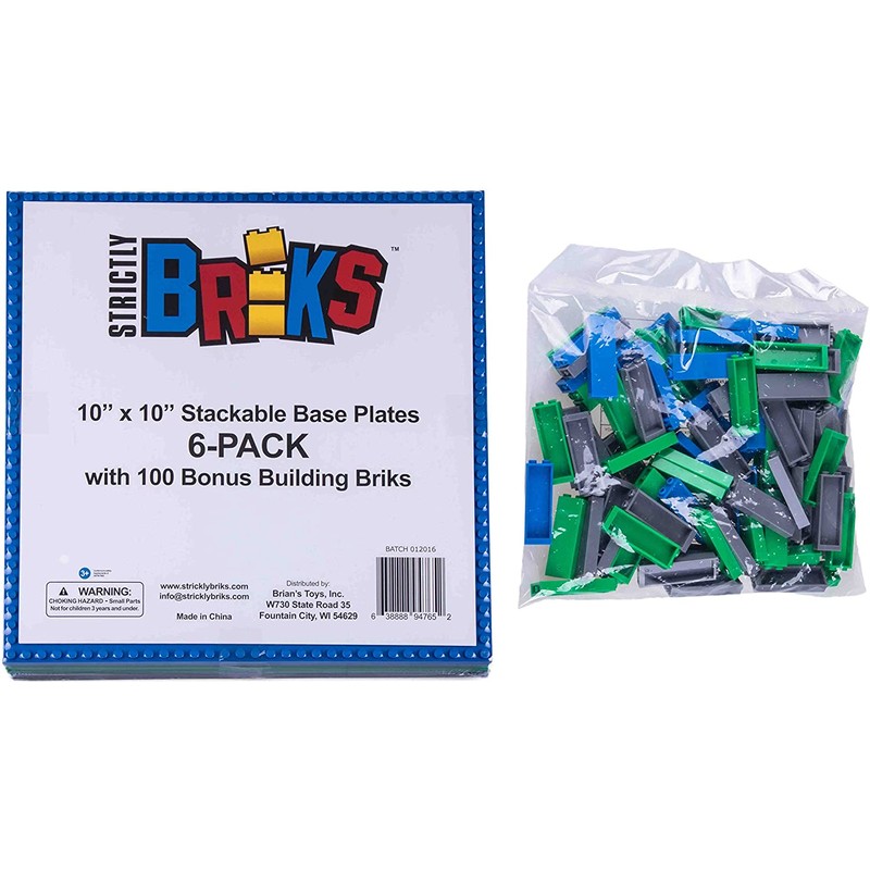 - INCLUDED IN THE SET: 6 stackable plates that measure 10" x 10" each (32 x 32 standard size pegs) and 50 patent pending Stackers (2 x 2 standard size pegs) in blue, green and gray. The full set is backed by our 100% money back satisfaction guarantee, so you can buy with confidence and enjoy the hundreds of unique Strictly Briks building sets you won’t find anywhere else.