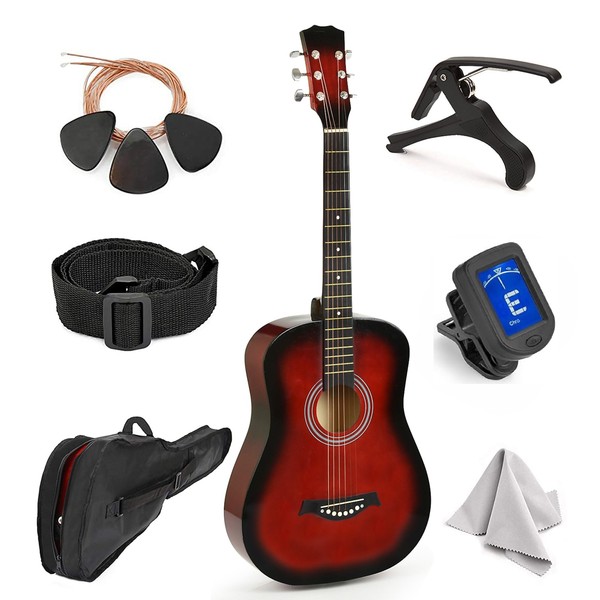 • ALL-IN-1 COMPLETE GUITAR STARTER KIT: To equip your kid with everything they need to start their music journey, our beginner acoustic guitar comes with all the required accessories: Guitar Bag, Tuner, Strap, Extra strings, Picks, Wash Cloth and Capo.