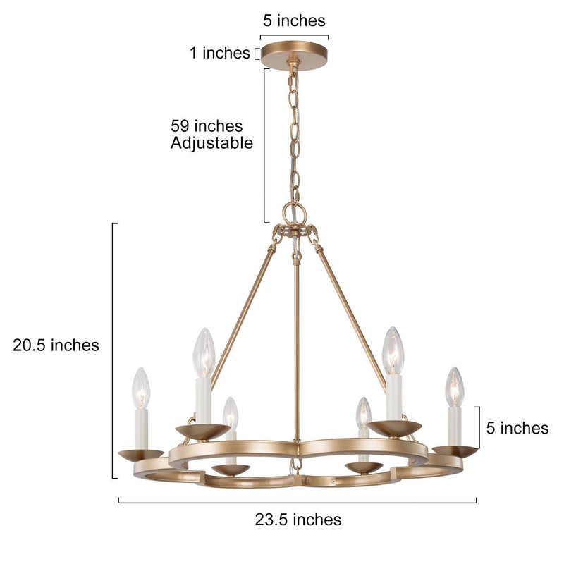 - Perfect Size & Adjustable Hanging Height--The gold chandelier light fixture size is 23.5" Dia x 20.5" H, with 5" H candlesticks. The canopy in gold finish size is 5" Dia x 1" H. Equipped with a 59" adjustable chain, allowing you to customize the lighting to suit your space perfectly. Whether you have high or low ceilings, this chandelier is compatible and adaptable.