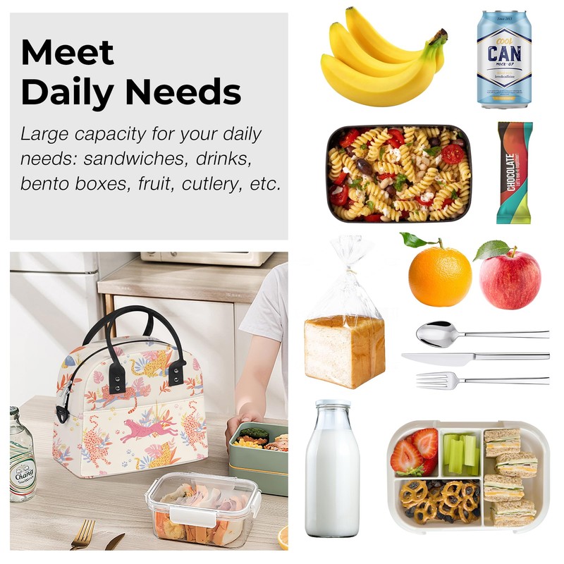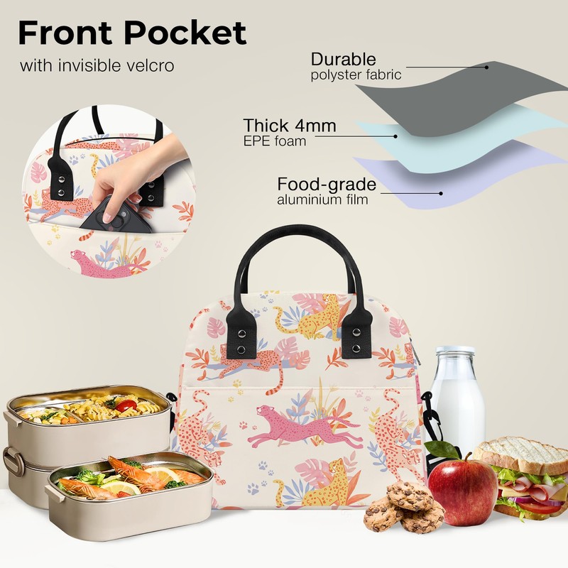 - Pink Women Lunch Tote: The overall beige pink color tone is dominant, scattered with leopard of different shapes and sizes, some running, some lying, some sitting, perfect for your daily meal carry