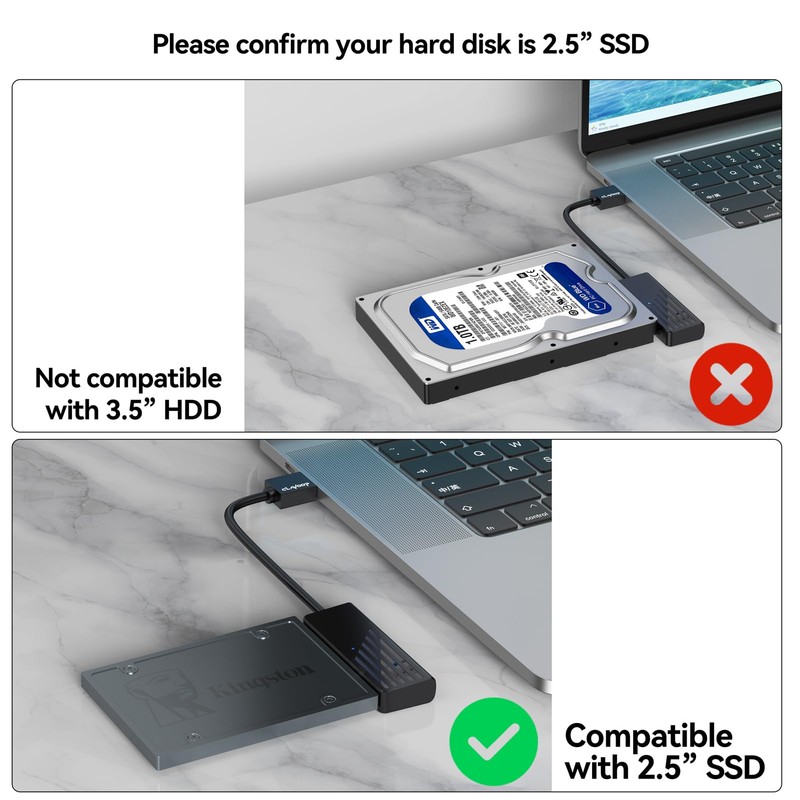 - 【Note】Only support 2.5" SATA SSD. Not support 3.5'' SSD & HDD! Not compatible with ATA (IDE), MSATA, M.2 and other interfaces (some power cords are not included)! Please confirm your hard drive type before purchasing. Sata to usb 3.0 adapter * 2 come with a 24-month warranty, and any questions you have are supported by our friendly and professional customer service.