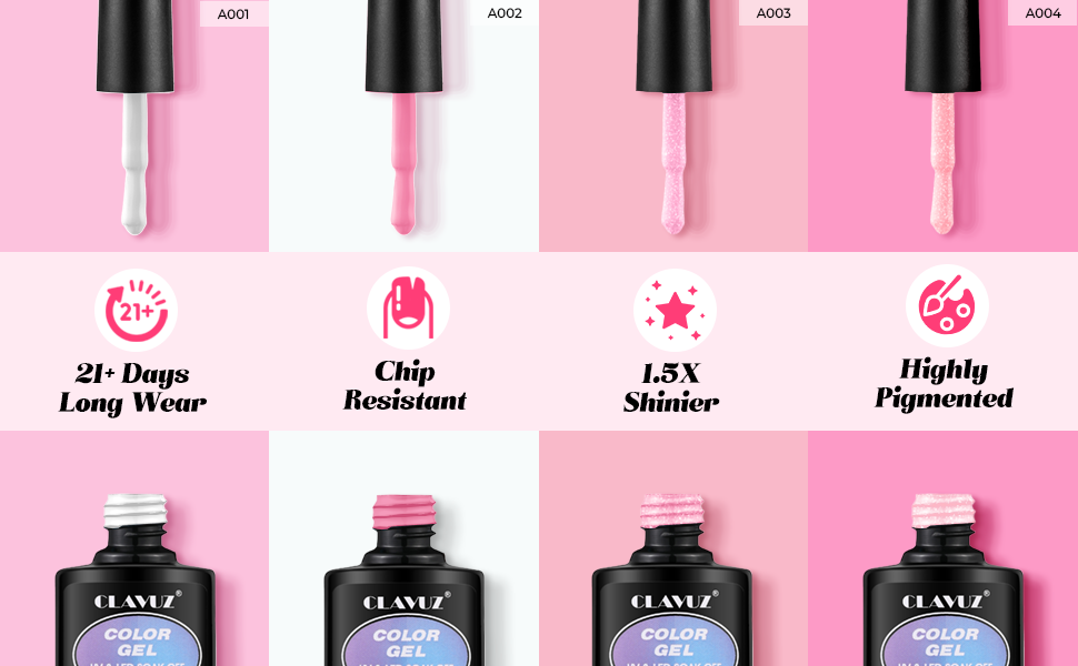 - CLAVUZ gel nail polish: 4 colors semi-permanent nail kit, white, dark pink, pink glitter and light pink glitter. 10ml per bottle. suitable for every season, make your life lively!