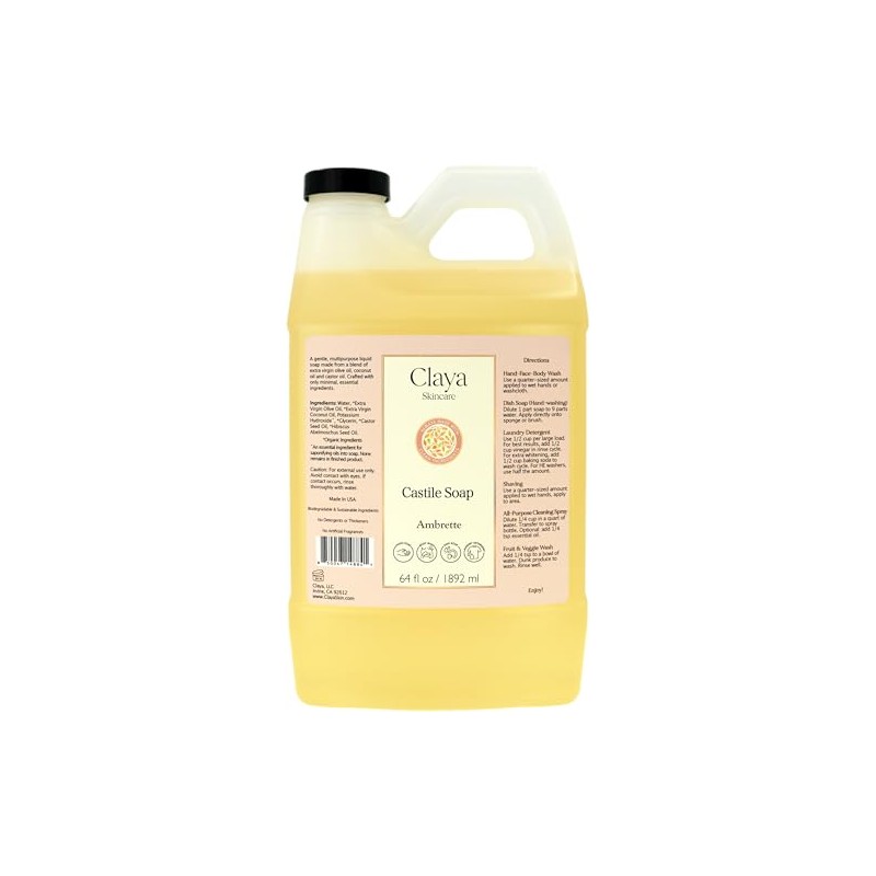 Claya Liquid Castile Soap – Organic Ingredients, Biodegradable, Gentle for Sensitive Skin and Versatile Use (64 fl oz, Ambrette)